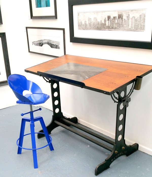 Steel trident stool, with fabricated T section legs and a screw mechanism for adjustable height. Retro-looking appeal, ideal with the handmade architect table.